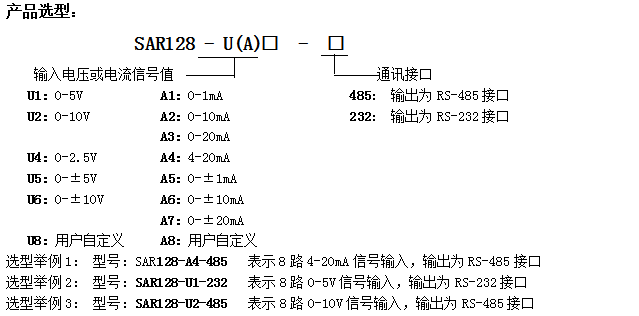 产品包括电源隔离,信号隔离、线性化,A/D转换和RS-485串行通信。每个串口最多可接255只 SAR128系列模块,通讯方式采用ASCII码通讯协议或MODBUS RTU通讯协议,波特率可由代码设置,能与其他厂家的控制模块挂在同一RS-485总线上,便于计算机编程。